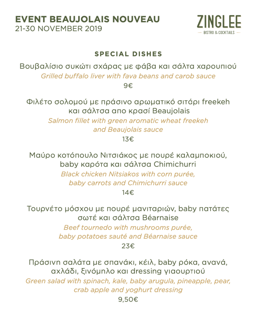 Μια εβδομάδα αφιερωμένη στα κρασιά Beaujolais Nouveau μόλις ξεκινά στο Zinglee! Από την Πέμπτη 21 Νοεμβρίου έως και το Σάββατο 30 Νοεμβρίου απολαύστε τα ξεχωριστά πιάτα ημέρας που ετοίμασε ο σεφ μας, συνοδεία από τα μοναδικά κρασιά του Joseph Drouhin!